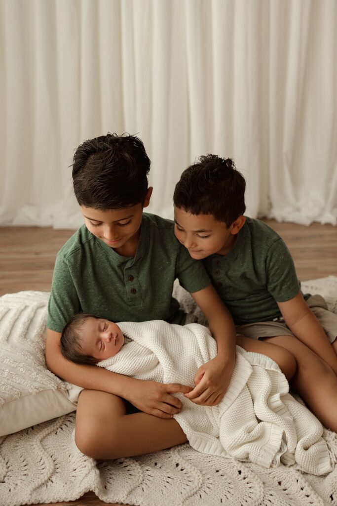 One of the most touching parts of this session was seeing big brothers step into their new roles. They were gentle, proud, and completely smitten with their new baby brother. Those quiet sibling moments—tiny hands resting on him, heads leaning close—are the kind of memories that families cherish for a lifetime.